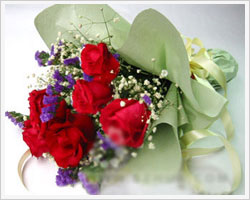 材質(zhì): 6枝紅色玫瑰,配勿忘我,滿天星,綠草豐滿 包裝: 綿紙簡單包裝,絲帶扎花.