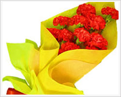 紅色康乃馨12枝, 黃色絲綿紙(或者黃色皺紋紙)單面包扎,紅色絲帶束扎。