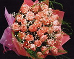 愛上你粉色玫瑰33枝,滿天星以及配草適量, 紅色皺紋紙圓形包裝,淡紫色絲綿紙束裹,紫色絲帶束扎